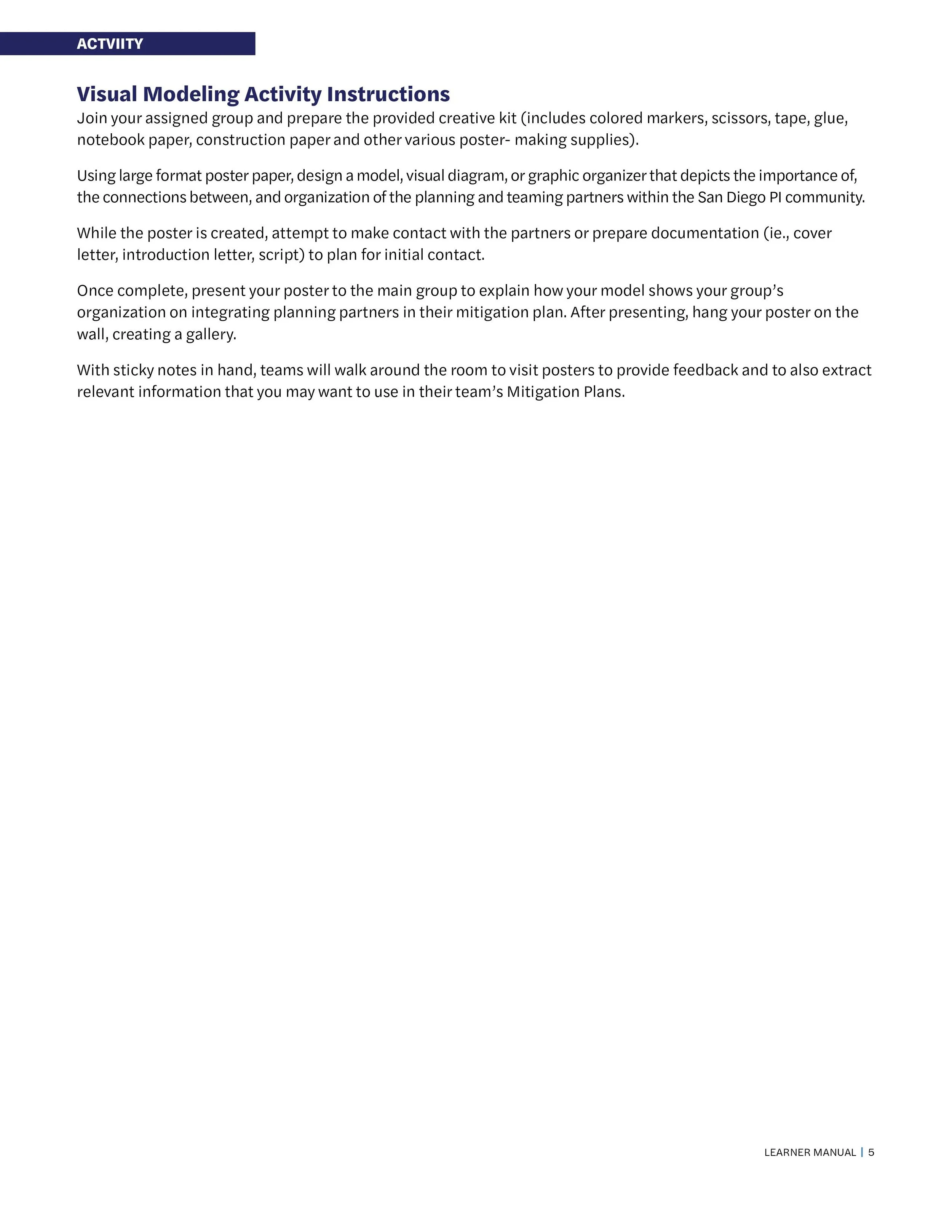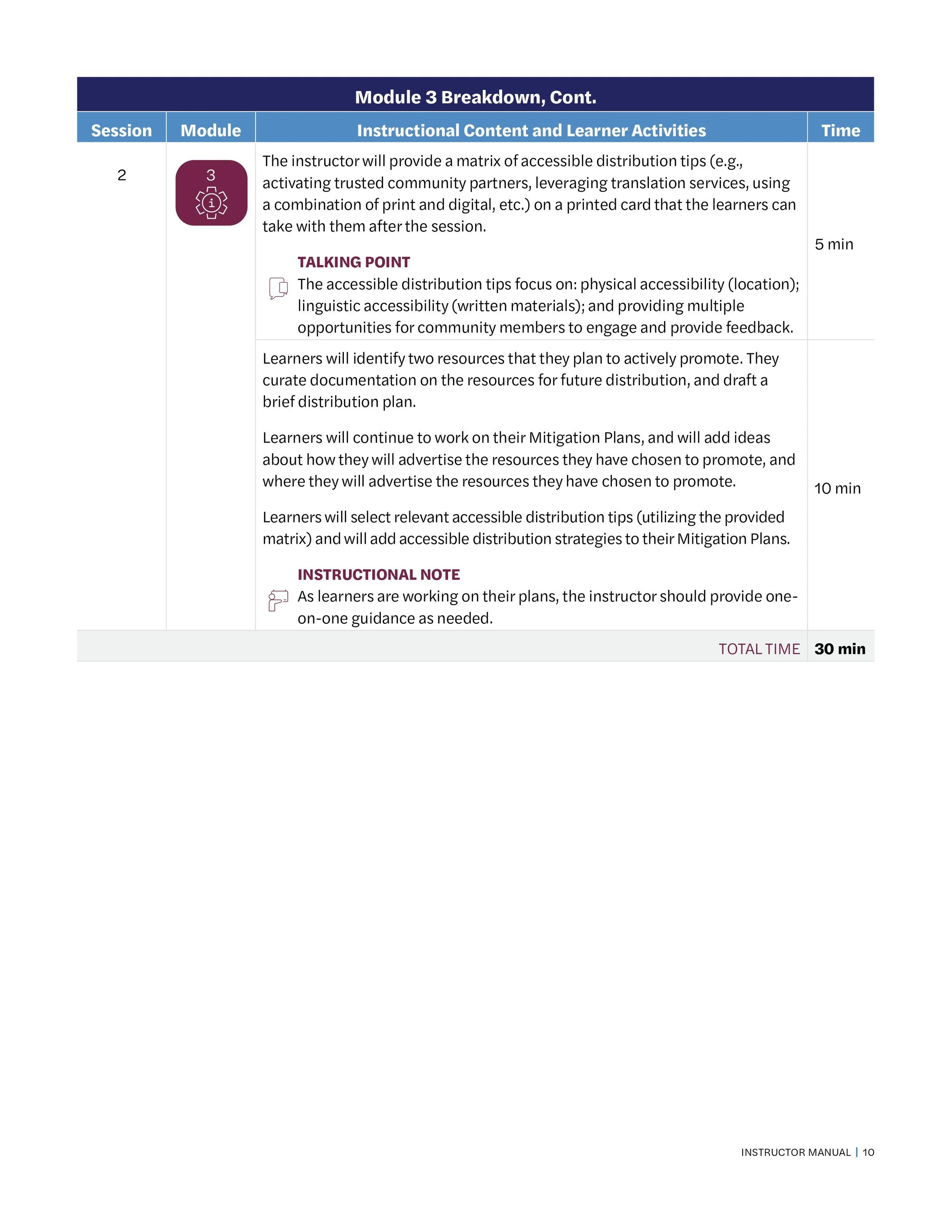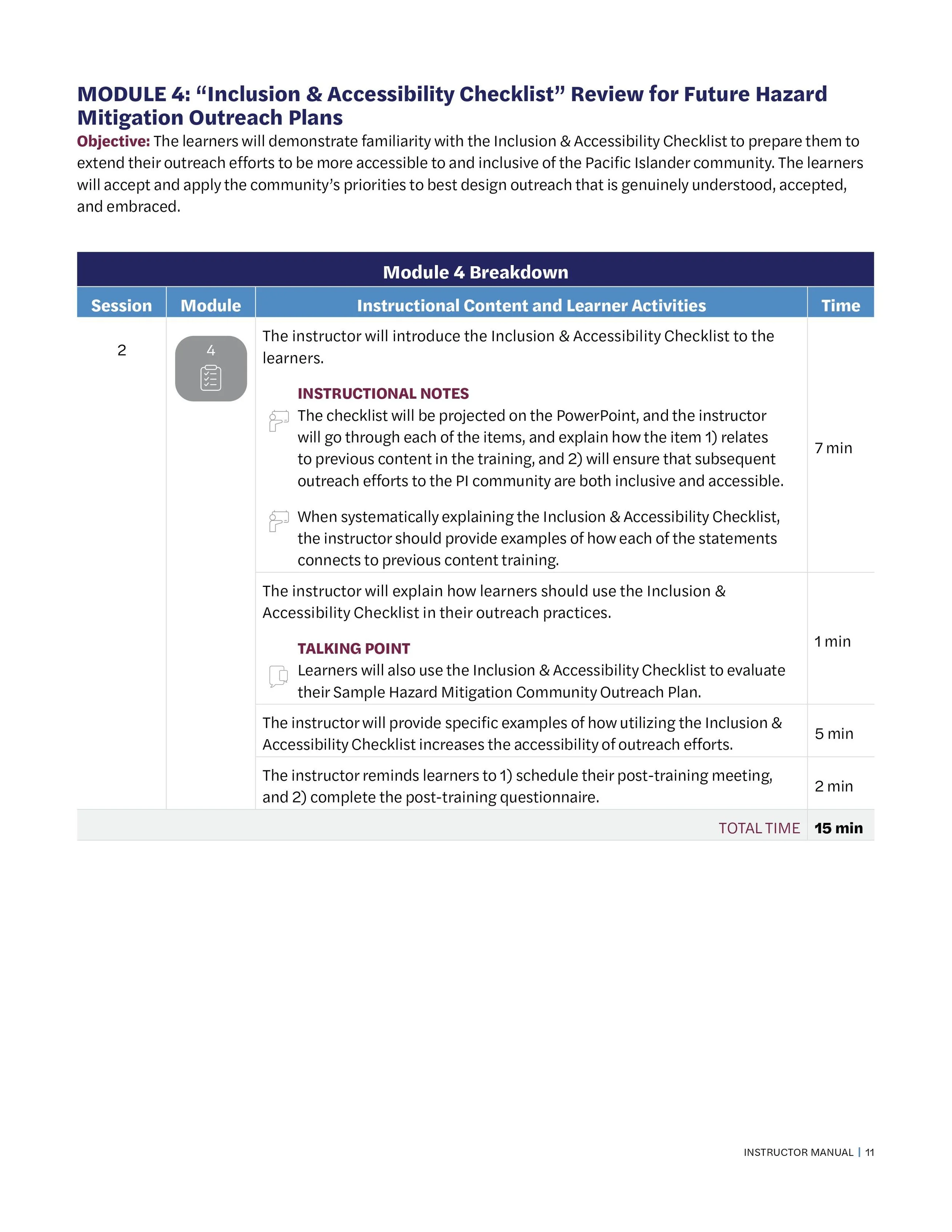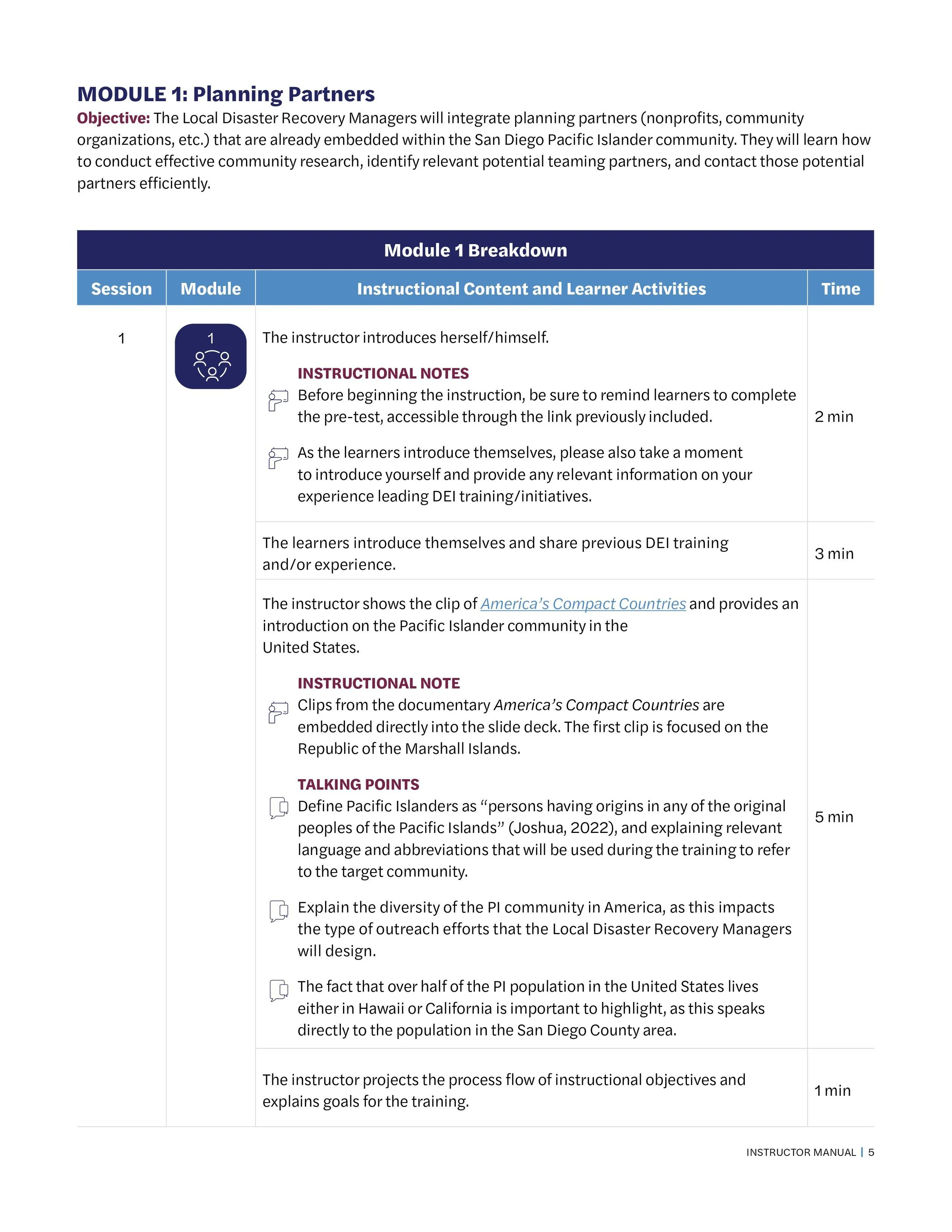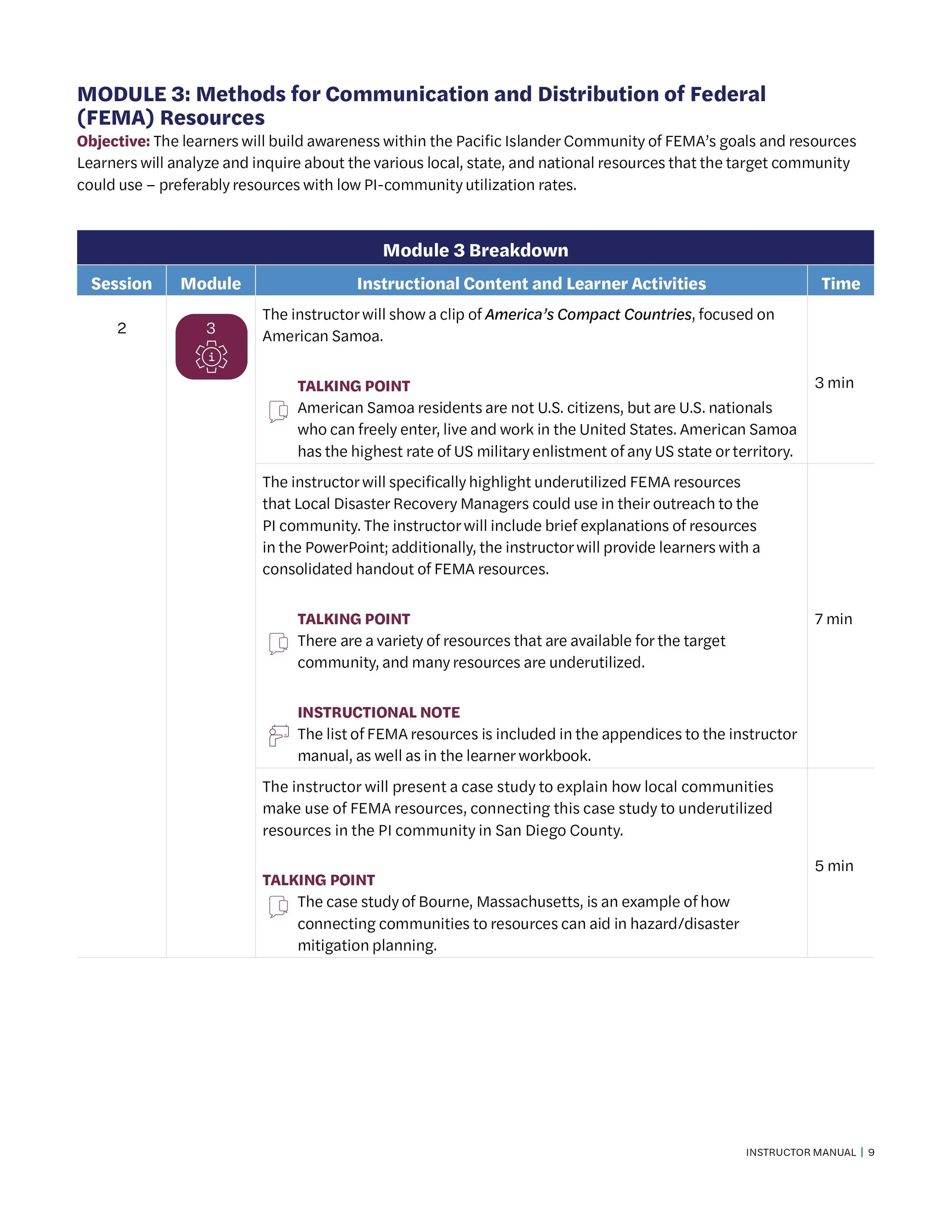The learner workbook contains similar content to the instructor manual, although it is designed for a different audience. The workbook also contains resources for the interactive activities conducted during the training.