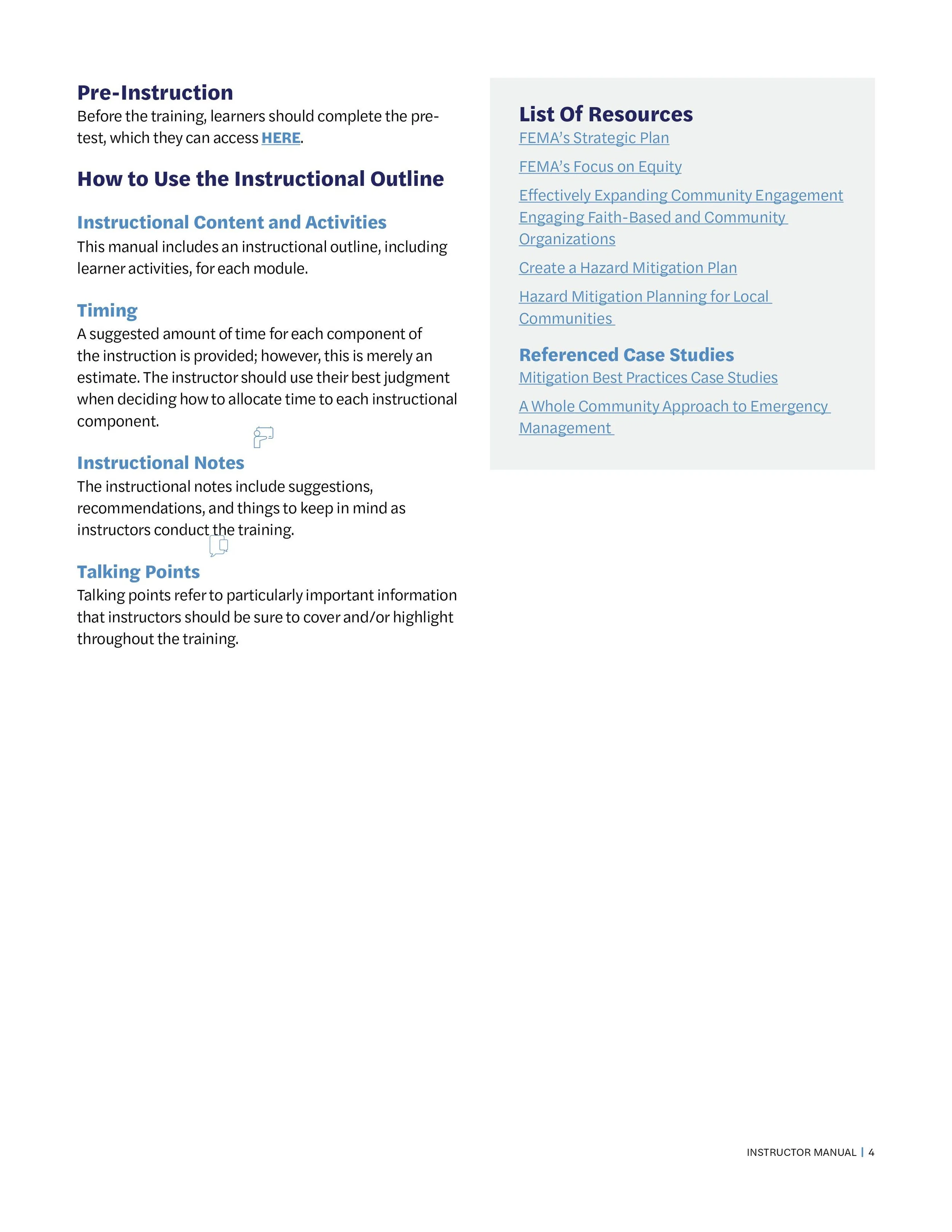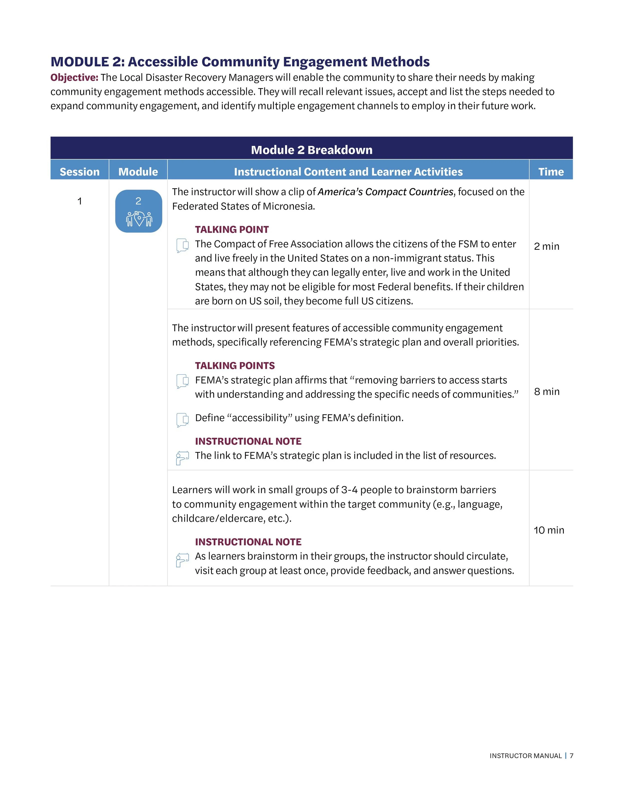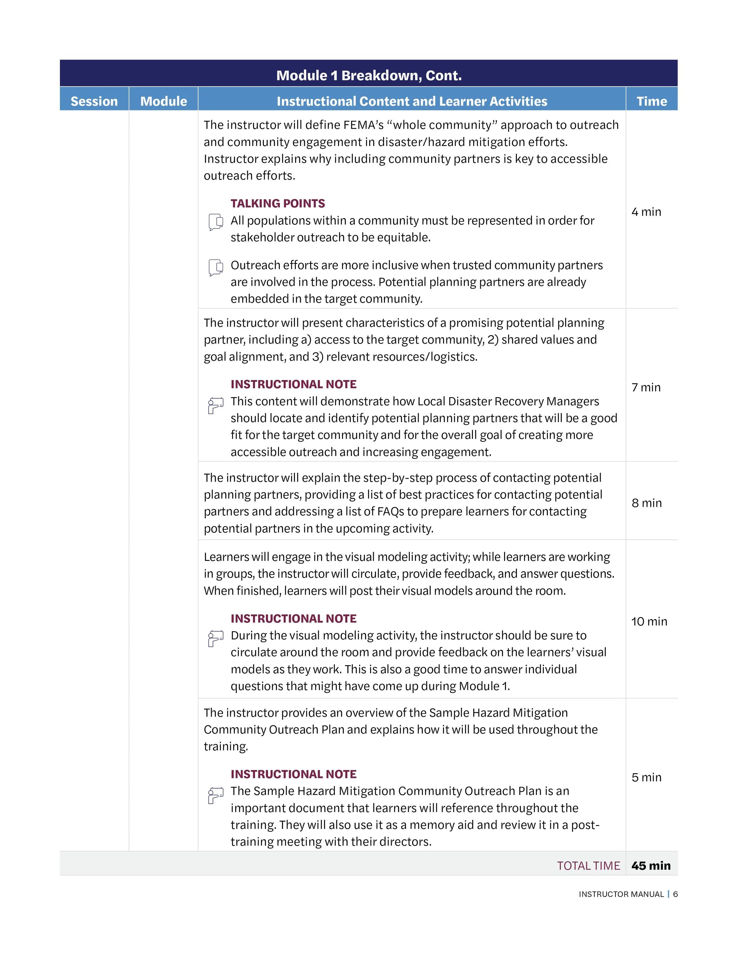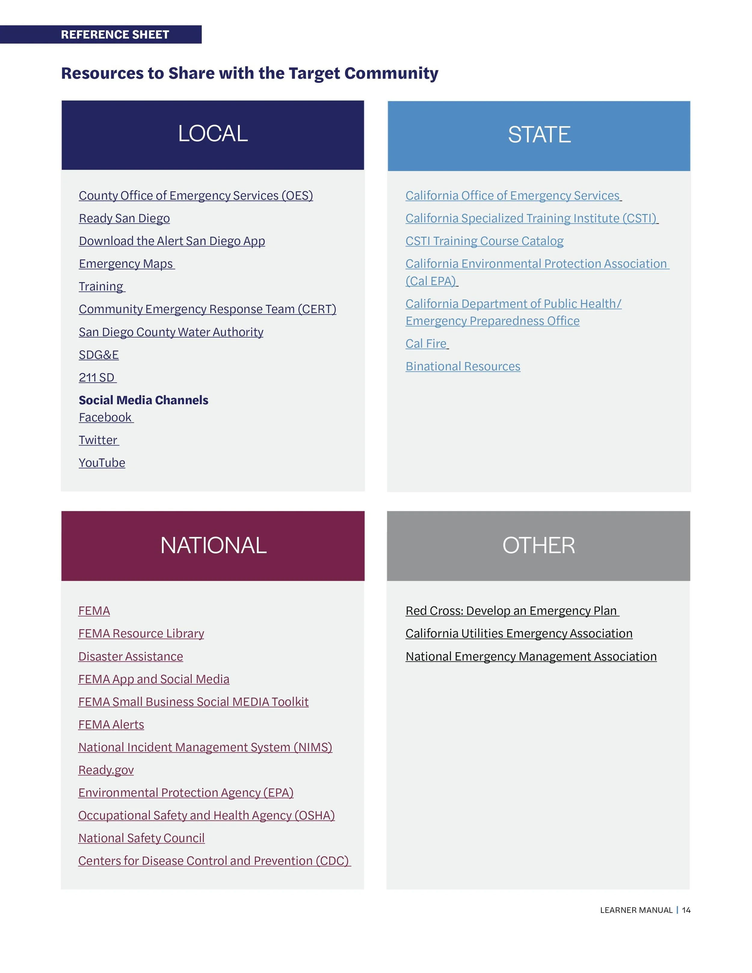 The learner workbook contains similar content to the instructor manual, although it is designed for a different audience. The workbook also contains resources for the interactive activities conducted during the training.