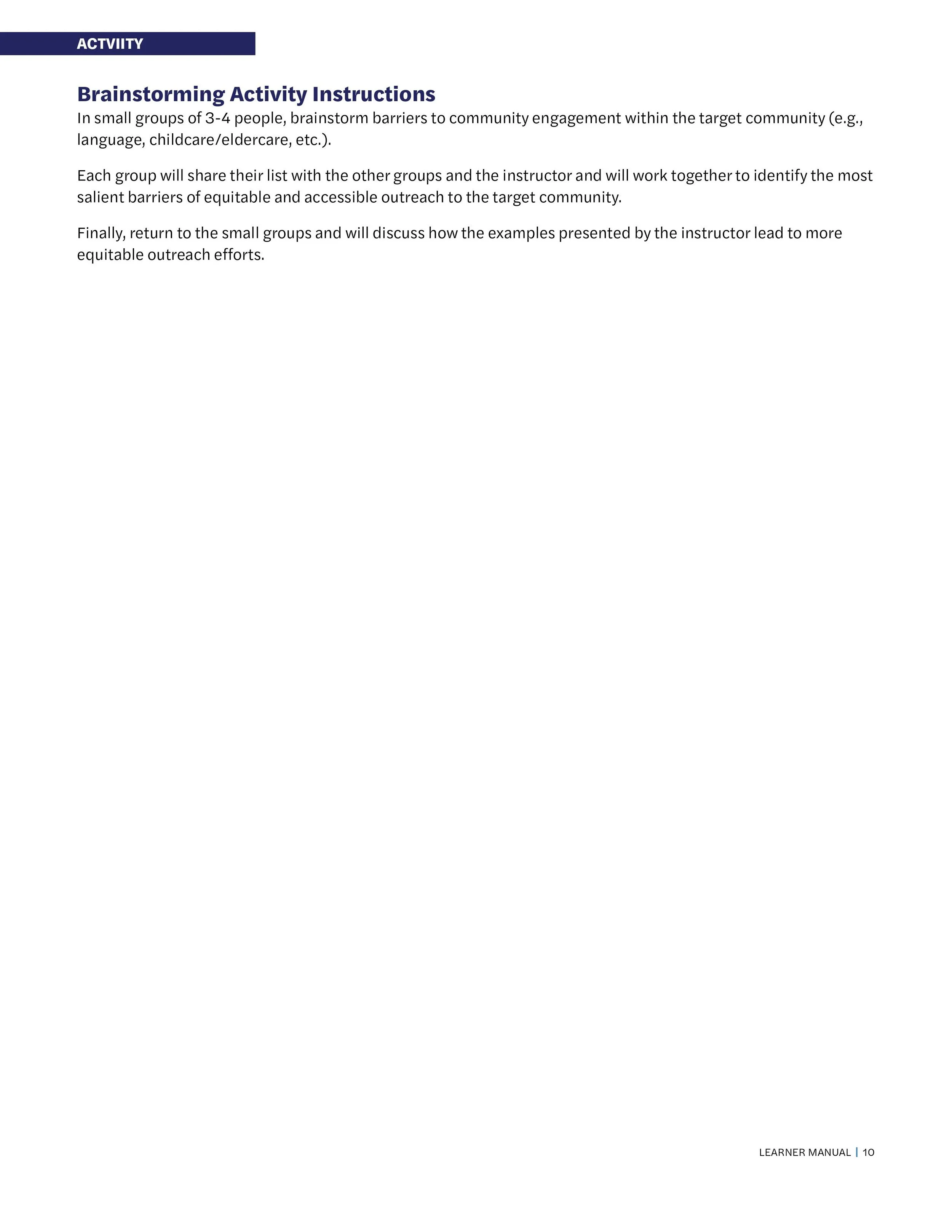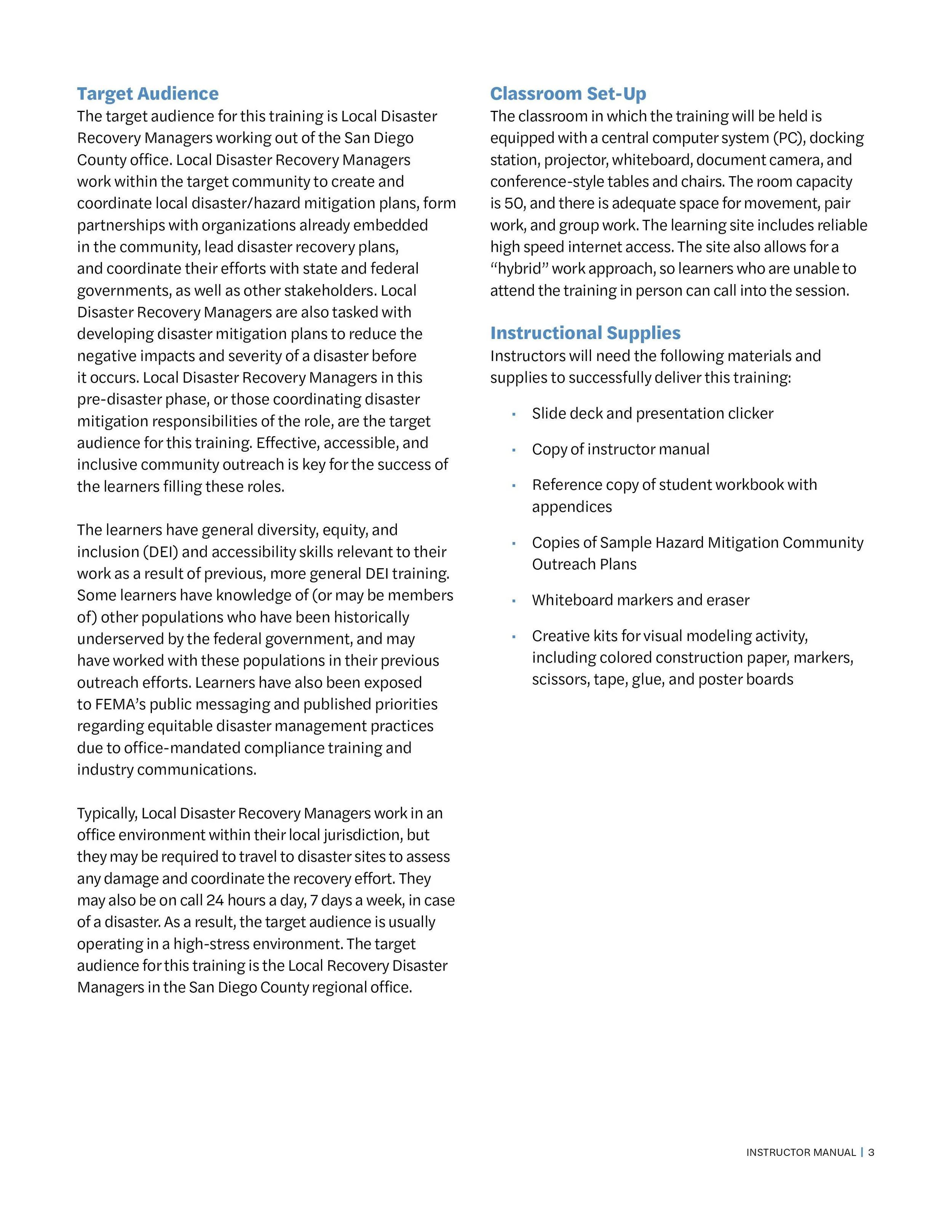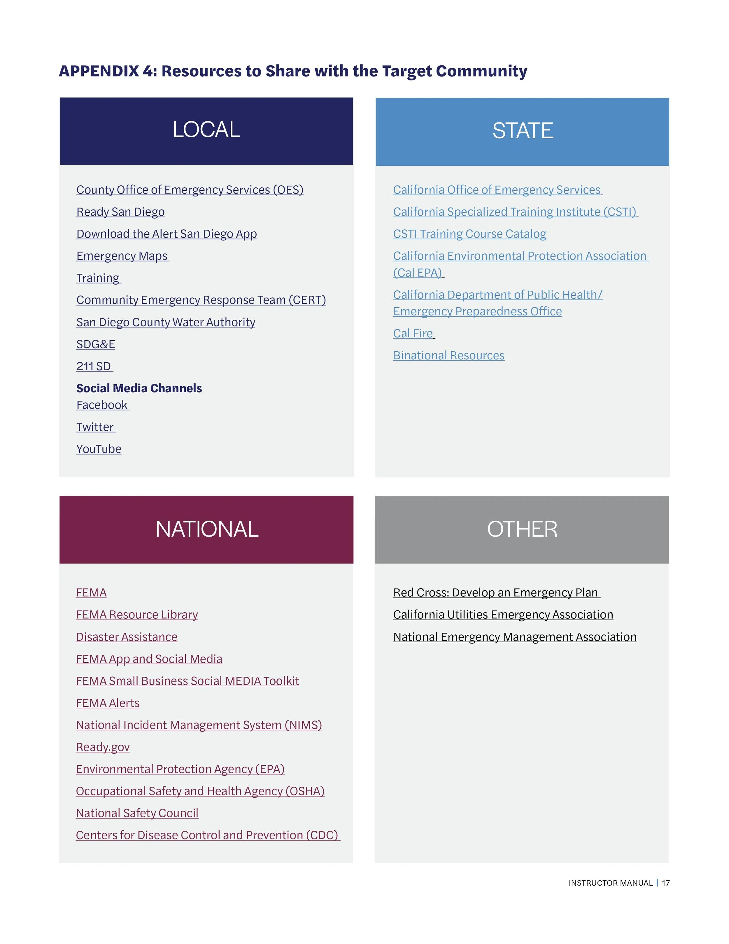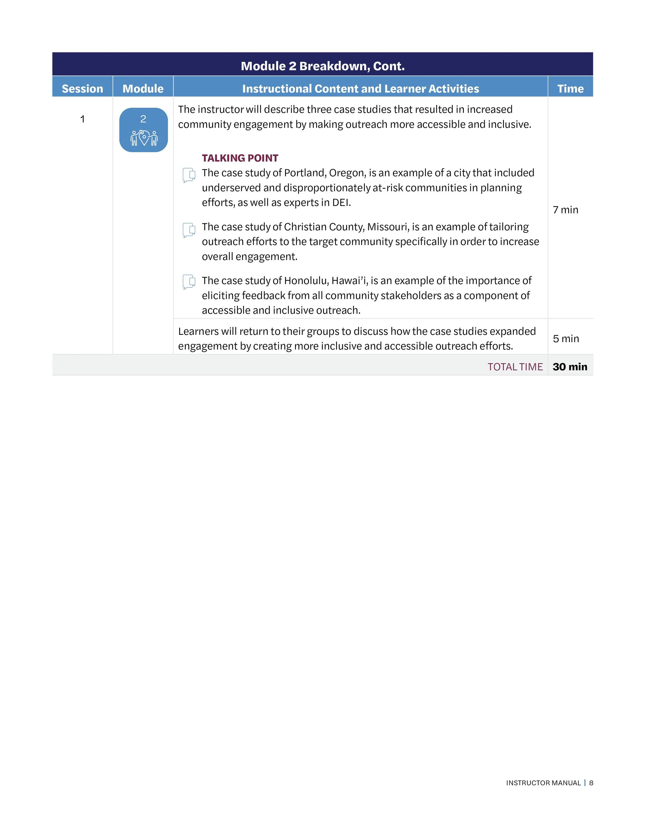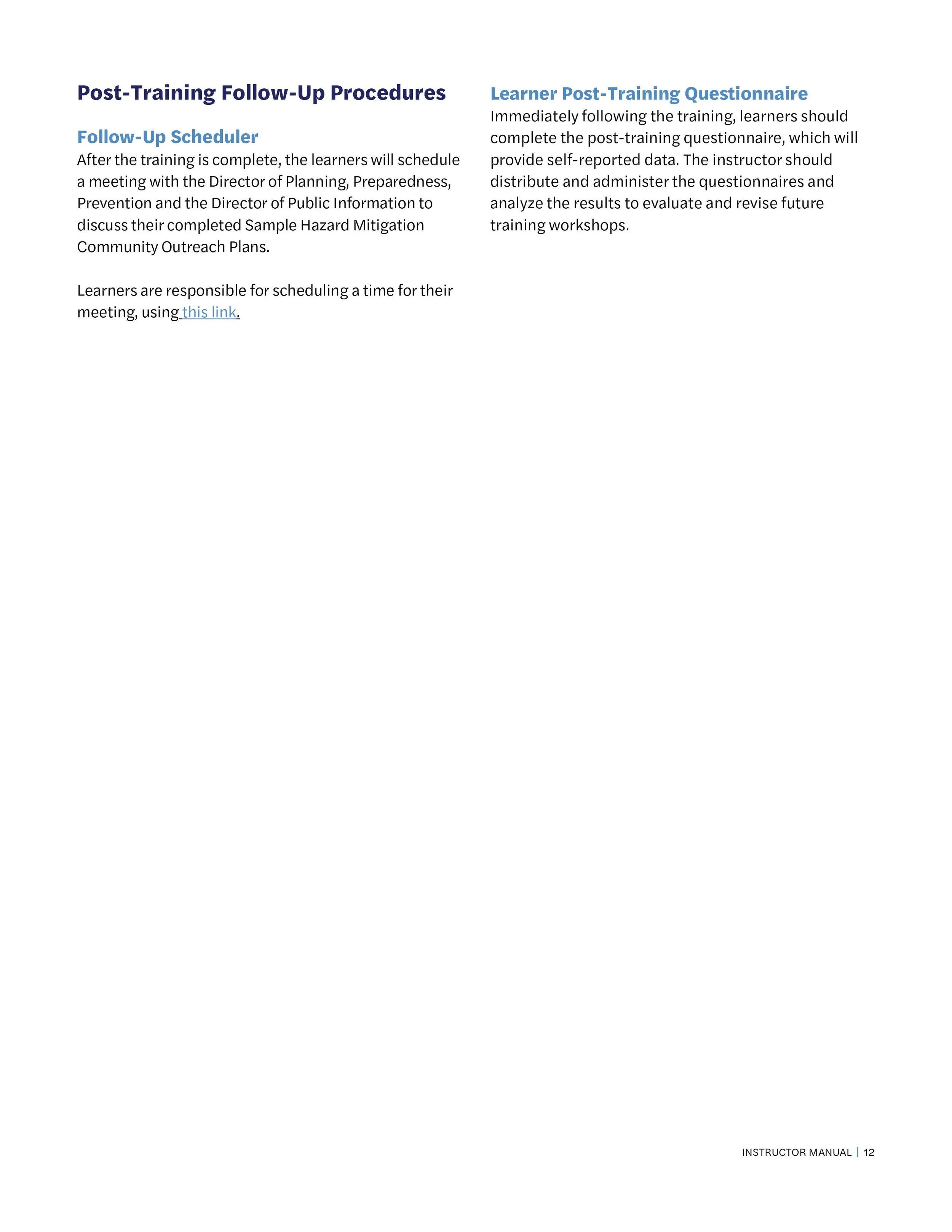 The learner workbook contains similar content to the instructor manual, although it is designed for a different audience. The workbook also contains resources for the interactive activities conducted during the training.