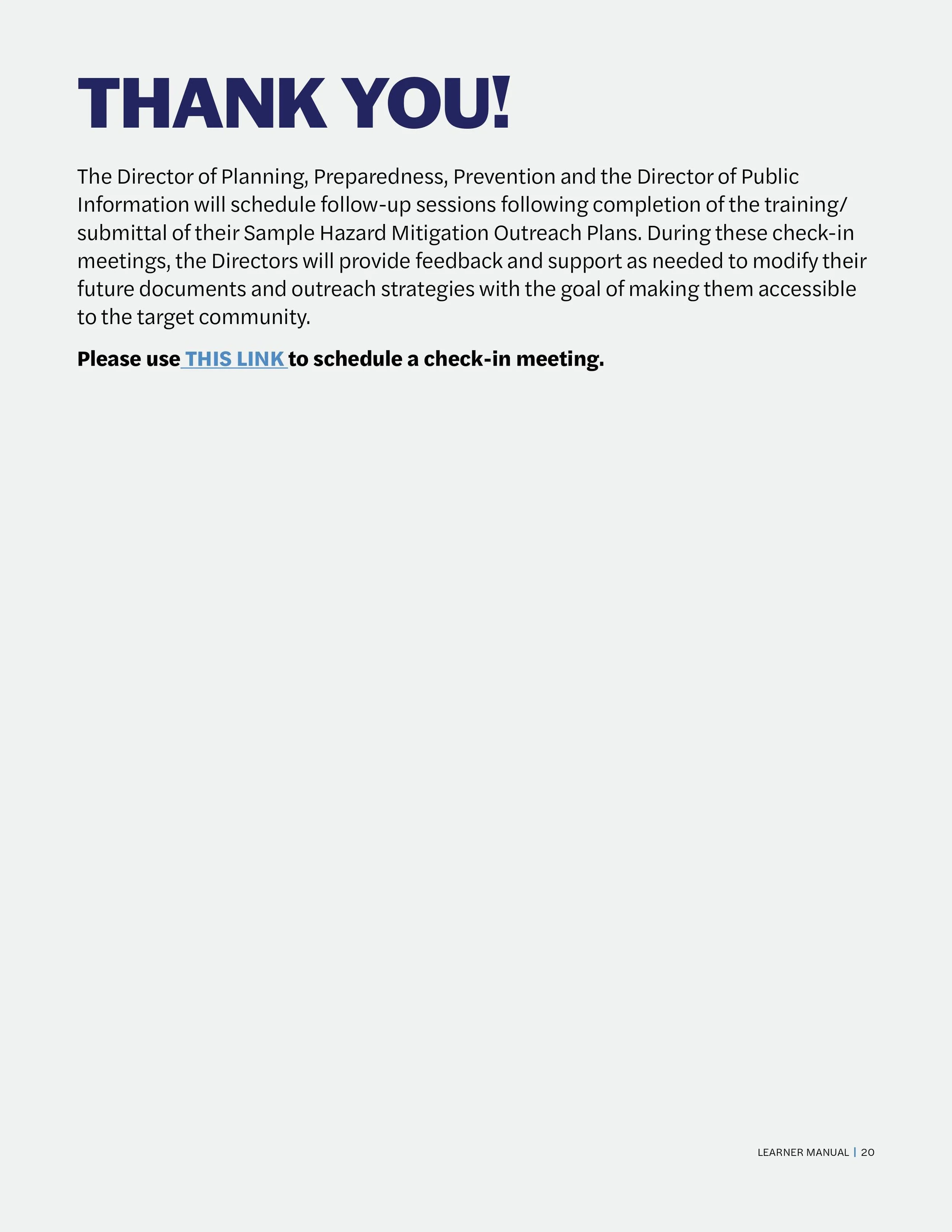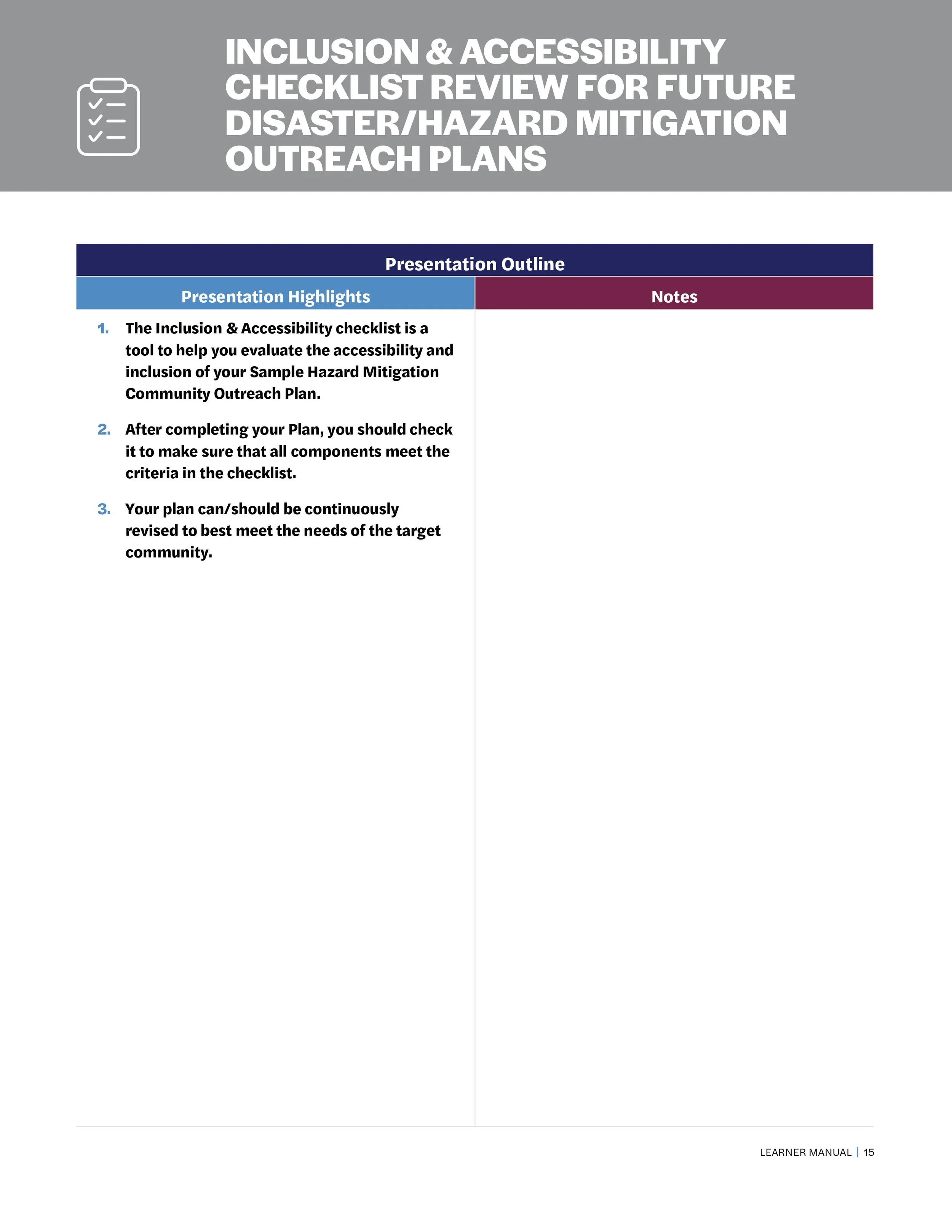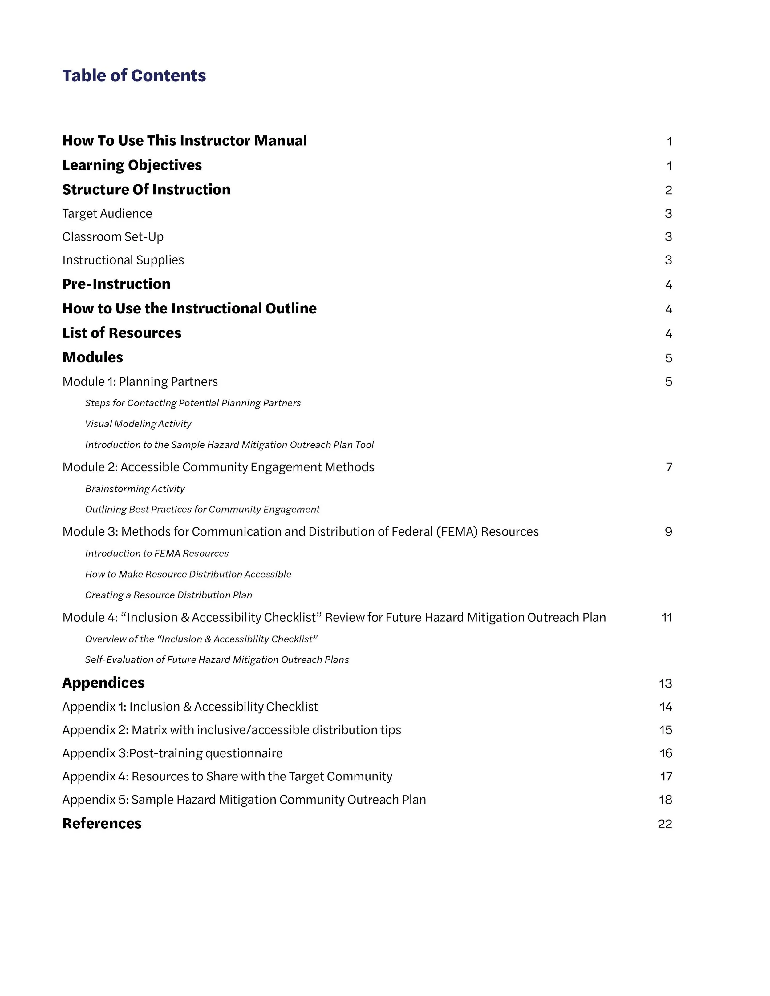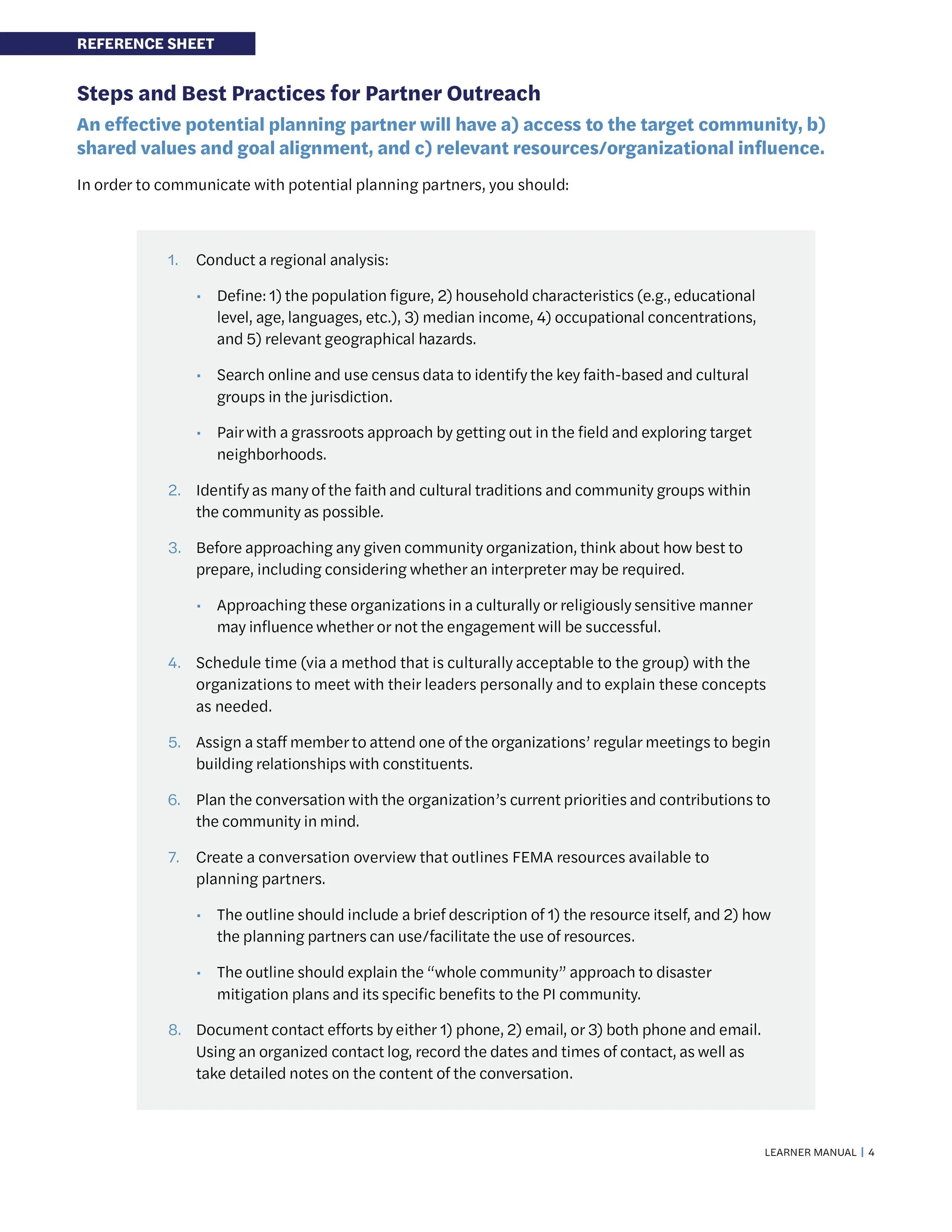 The learner workbook contains similar content to the instructor manual, although it is designed for a different audience. The workbook also contains resources for the interactive activities conducted during the training.