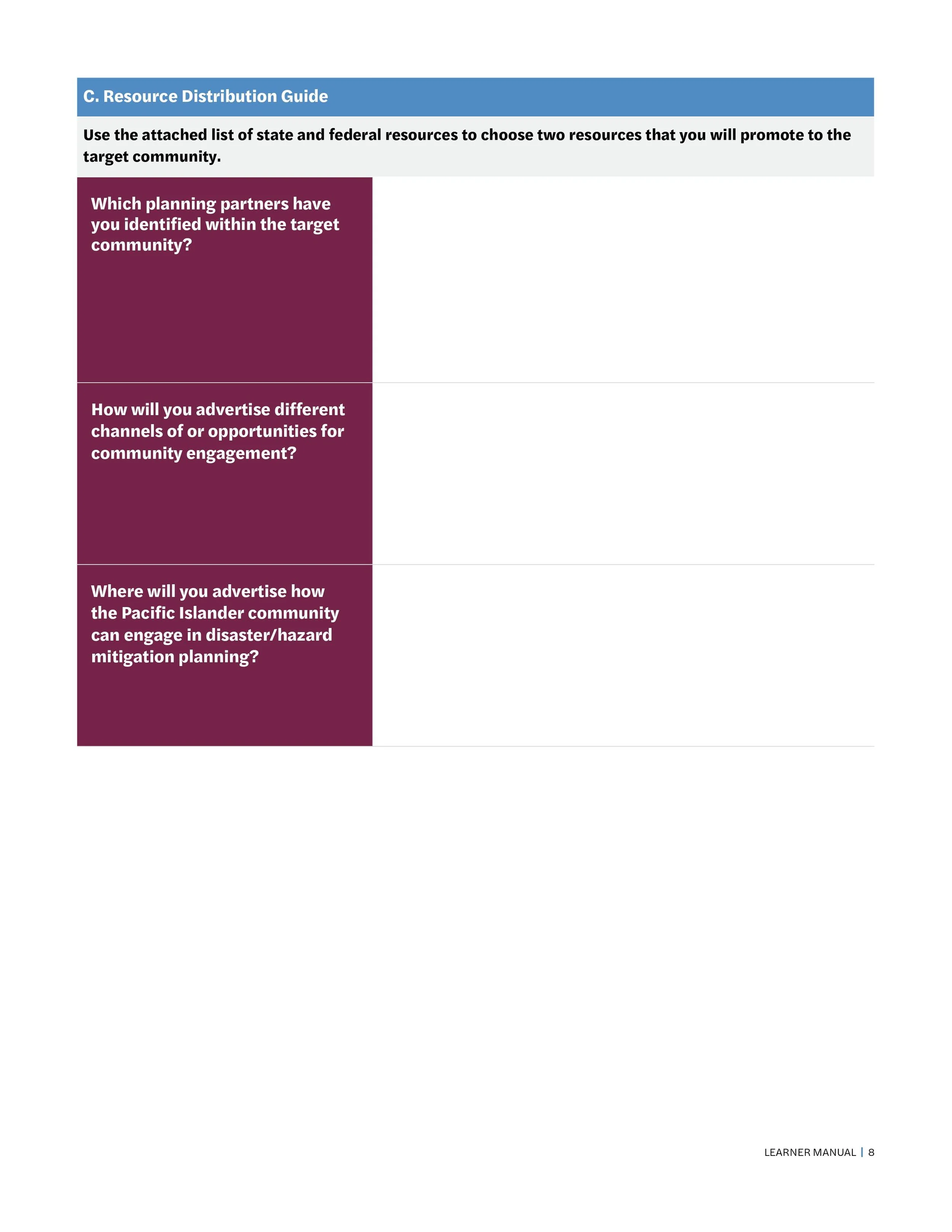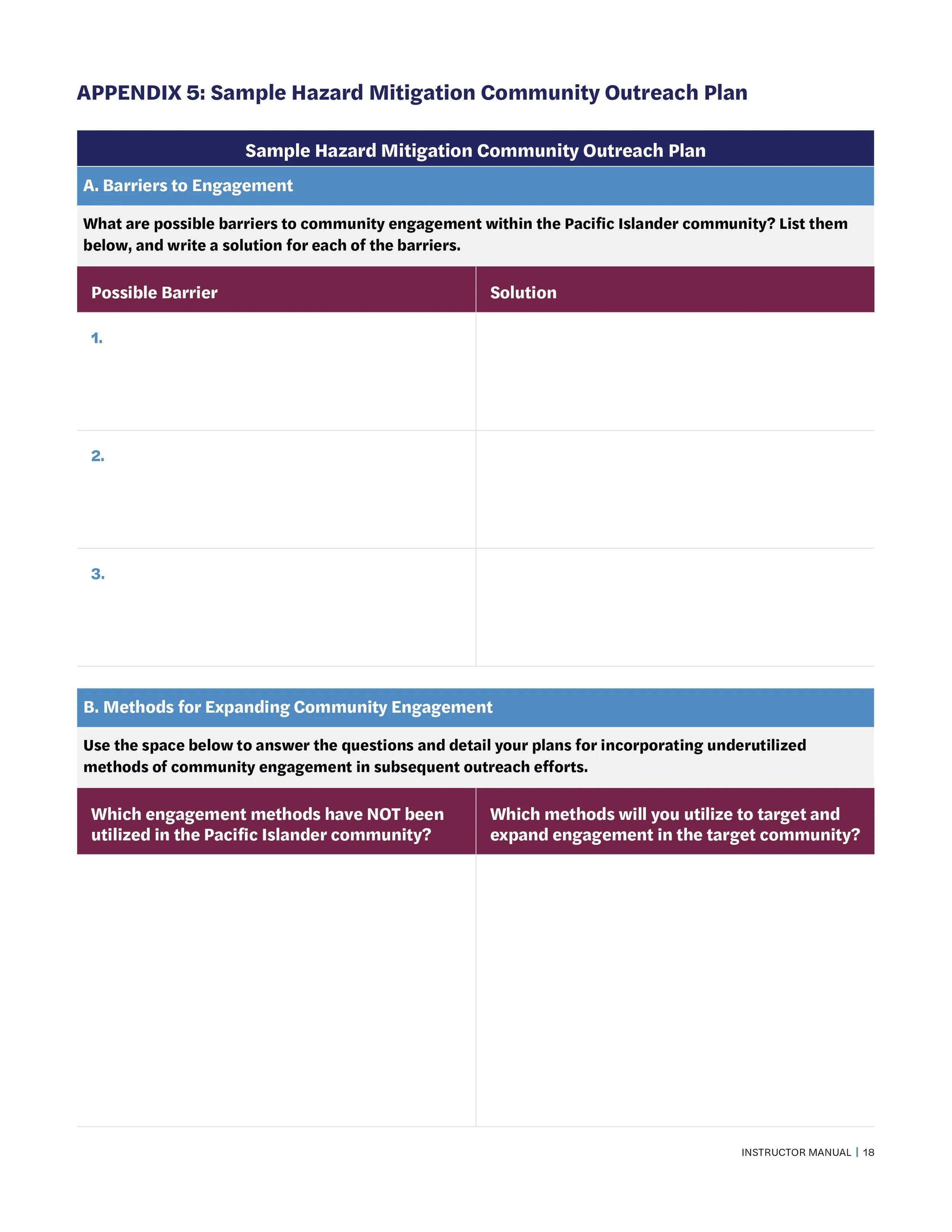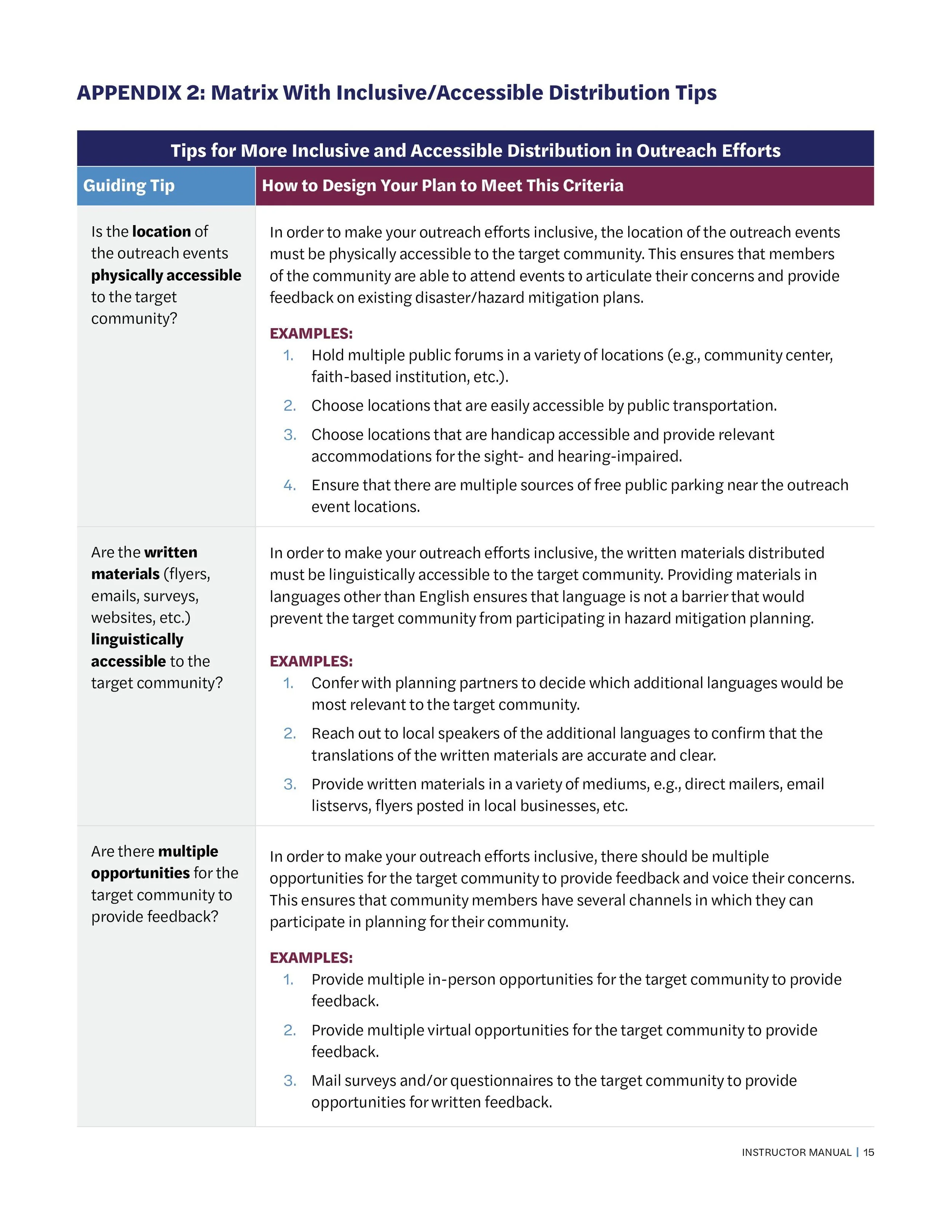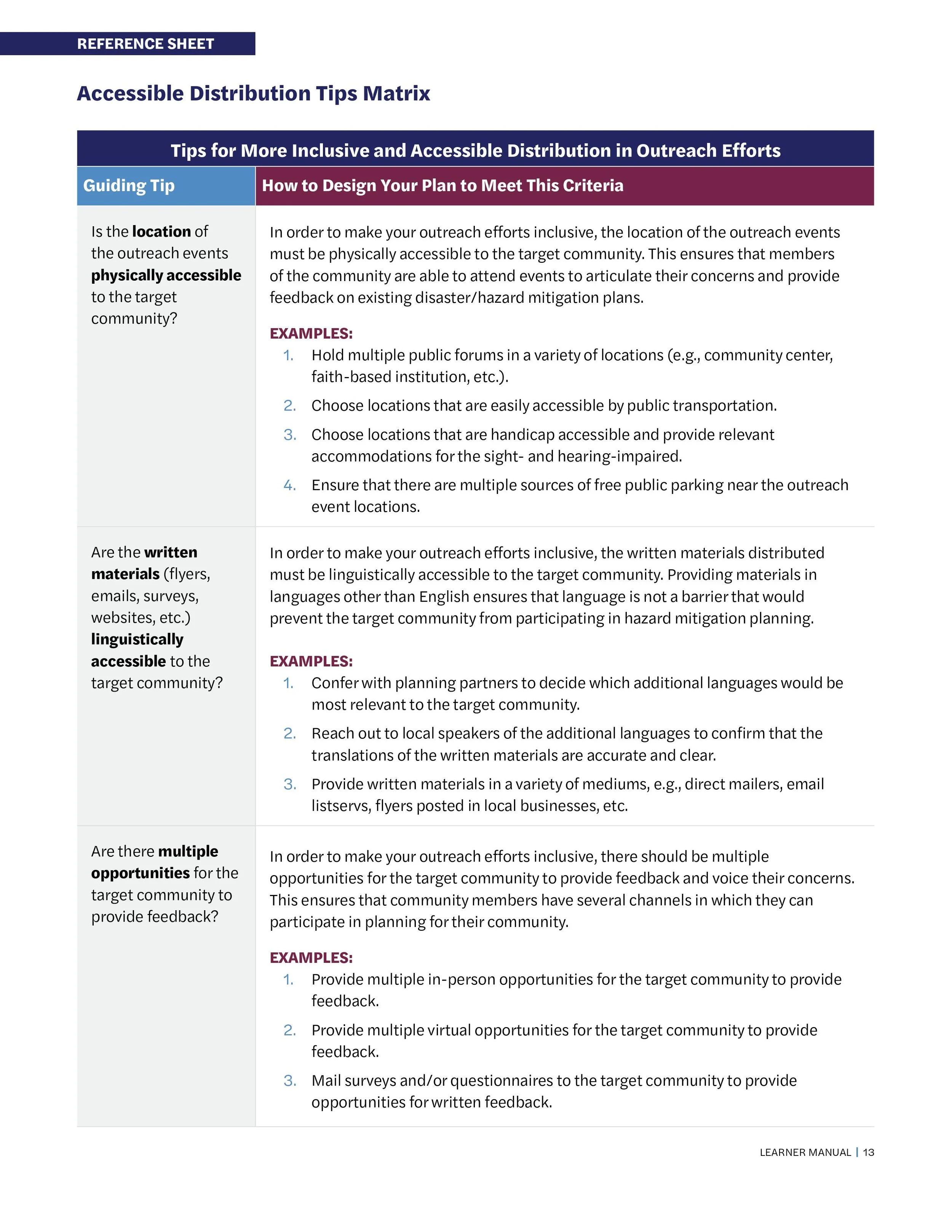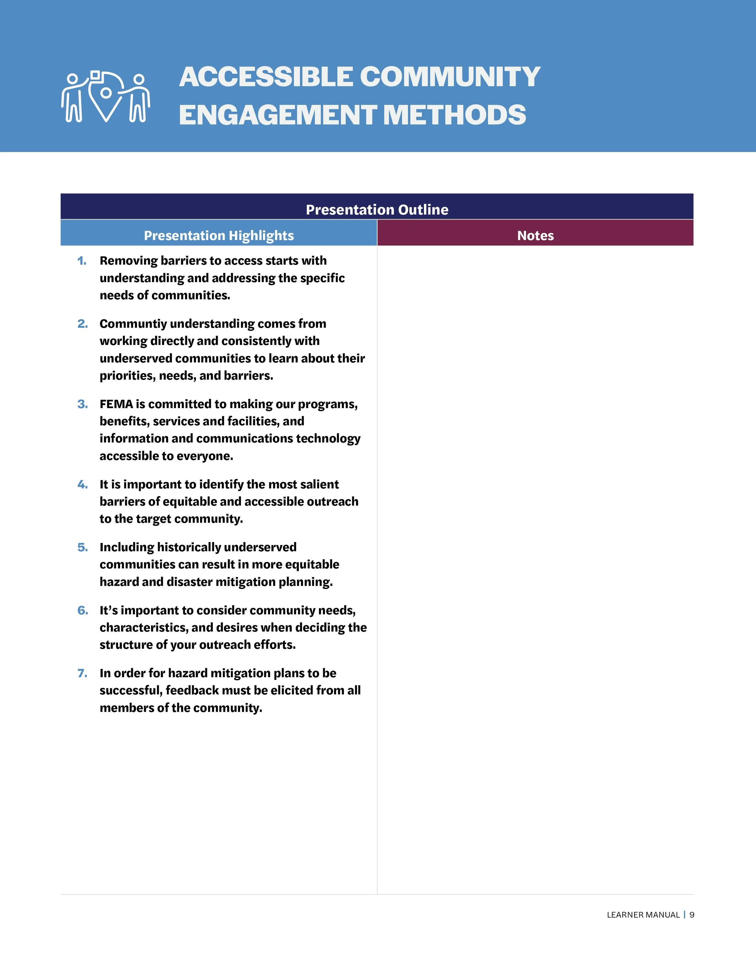 The learner workbook contains similar content to the instructor manual, although it is designed for a different audience. The workbook also contains resources for the interactive activities conducted during the training.
