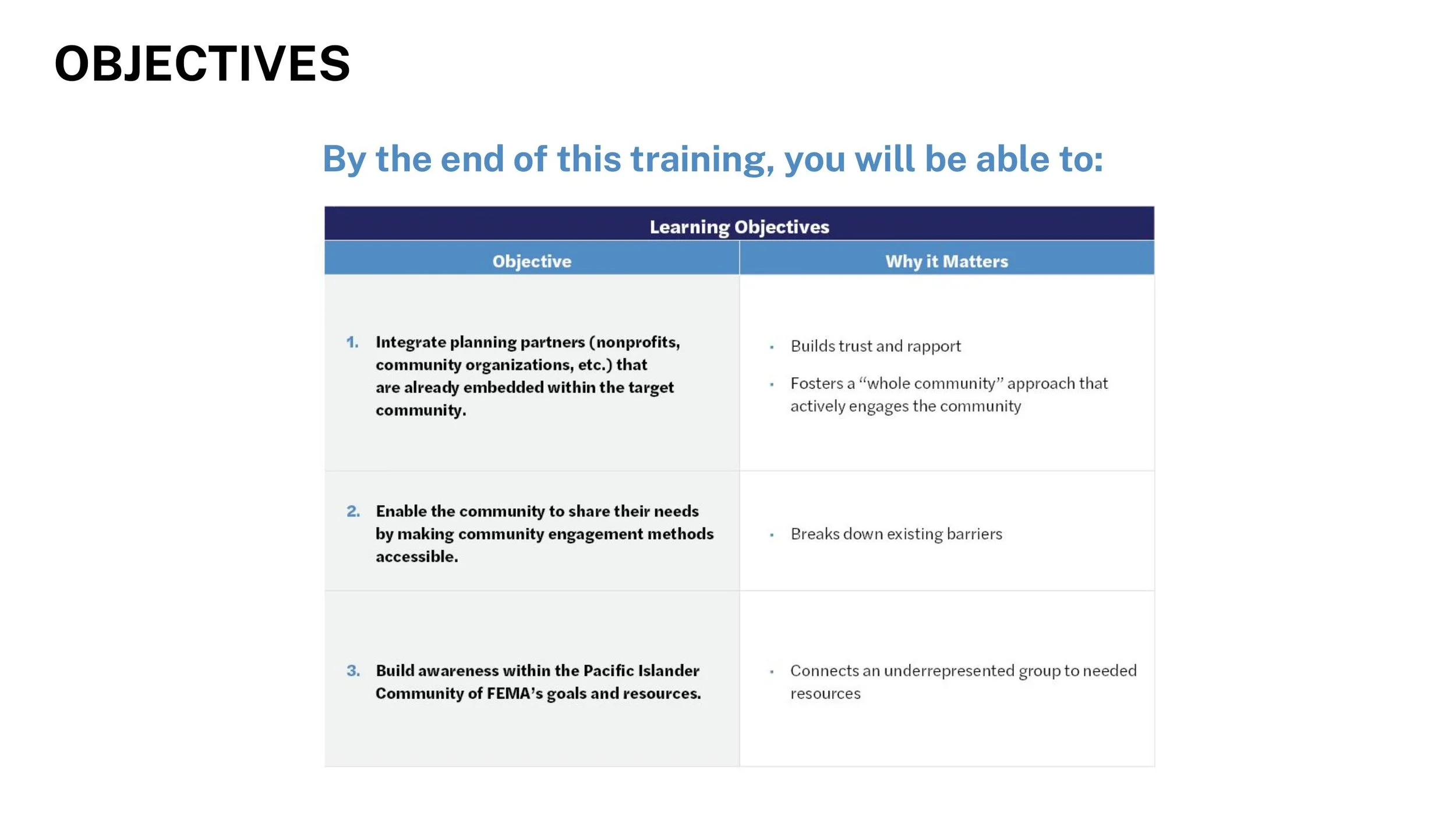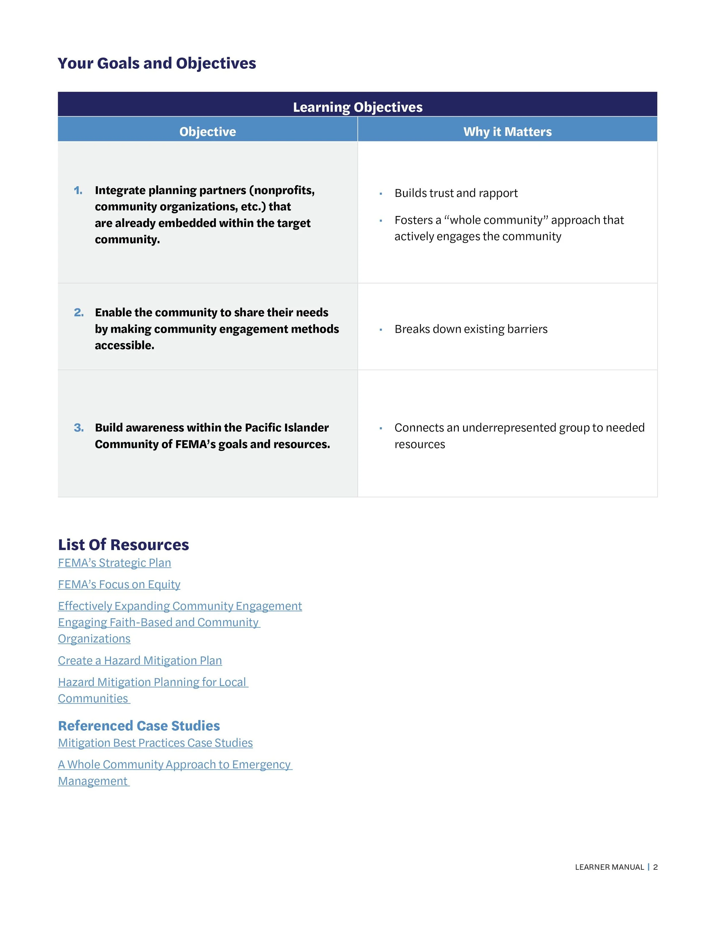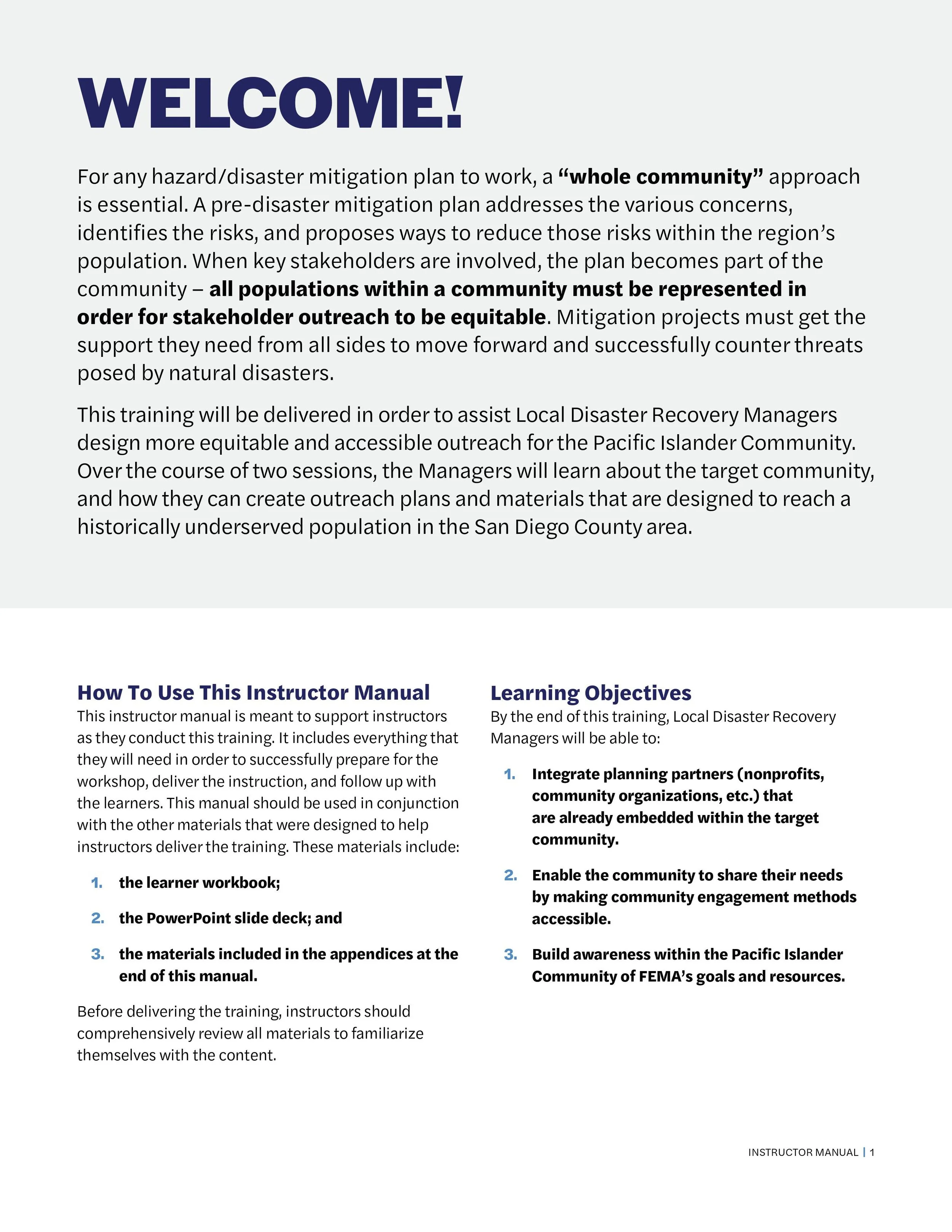 I was part of a team that designed a comprehensive training solution to improve outreach inclusion and accessibility to the Pacific Islander Community for FEMA’s Local Disaster Recovery Managers.